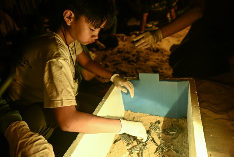 Il fait nuit noire sur la plage du sud de la Thaïlande où Prin Uthaisangchai, 12 ans, regarde anxieusement un nid de tortues luth d'où des dizaines d'œufs de cette espèce marine menacée doivent éclore dans le sable.