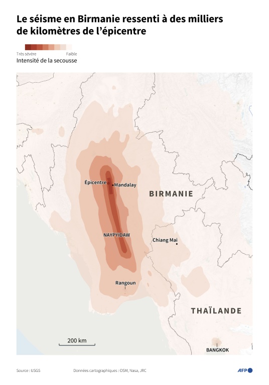Les experts anticipent des milliers de morts supplémentaires par rapport au bilan établi par le chef de la junte à 2.719 morts, car la faille de Sagaing, à l'origine du séisme, traverse des régions parmi les plus peuplées du pays, avec des villes comme Naypyidaw et Mandalay, la deuxième du pays.