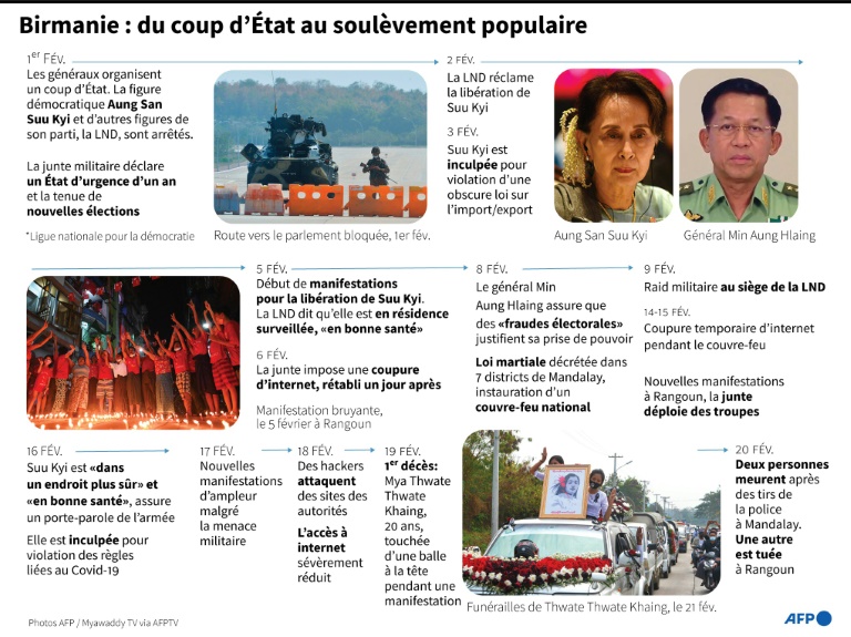 Trois semaines après le putsch du 1er février, la mobilisation pro-démocratie ne faiblit pas avec des dizaines de milliers de manifestants dimanche, et une campagne de désobéissance civile qui perturbe le fonctionnement de l'Etat et l'économie.