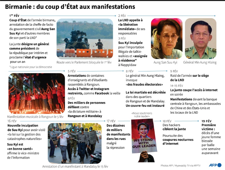 Près de trois semaines après le putsch du 1er février qui a renversé le gouvernement civil d'Aung San Suu Kyi et mis fin à une fragile transition démocratique de 10 ans, le concert de protestations internationales et l'annonce de nouvelles sanctions n'infléchit pas les généraux.