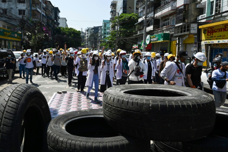 A Rangoun, la capitale économique du pays, le quartier de San Chaung faisait comme les jours précédent l'objet d'un face à face pour le moment pacifique avec les forces de l'ordre, les manifestants se protégeant derrière des barricades de fortune construites avec de vieux pneus, des sacs de sable, et du fil de fer barbelé.