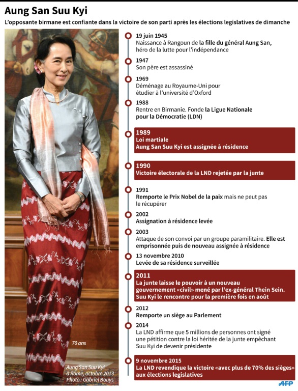 La victoire électorale écrasante du parti de l'opposante birmane Aung San Suu Kyi a été enfin annoncée vendredi, propulsant au pouvoir celle qui a passé près de trente ans à lutter contre la junte militaire puis ses héritiers.