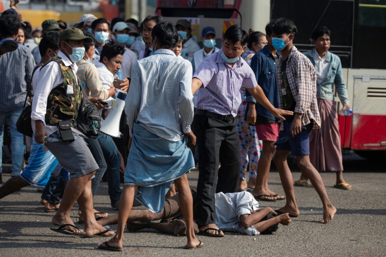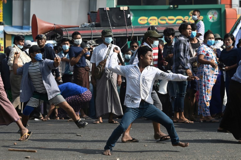 Les riverains ont commencé à frapper sur des casseroles et des marmites, un acte devenu symbole de la résistance anti-junte, pour protester contre la manifestation pro-militaire. À midi, des affrontements ont éclaté aux abords de la gare centrale de Rangoun. Des partisans des militaires - certains armés de bouts de tuyaux, de couteaux et faisant usage de lance-pierres - se sont retournés contre les habitants qui les huaient. "Ils nous ont visés avec des lance-pierres depuis une voiture ... une dizaine de personnes ont été blessées à la tête", a raconté à l'AFP Aung Zin Lin, 38 ans, qui vit à proximité.