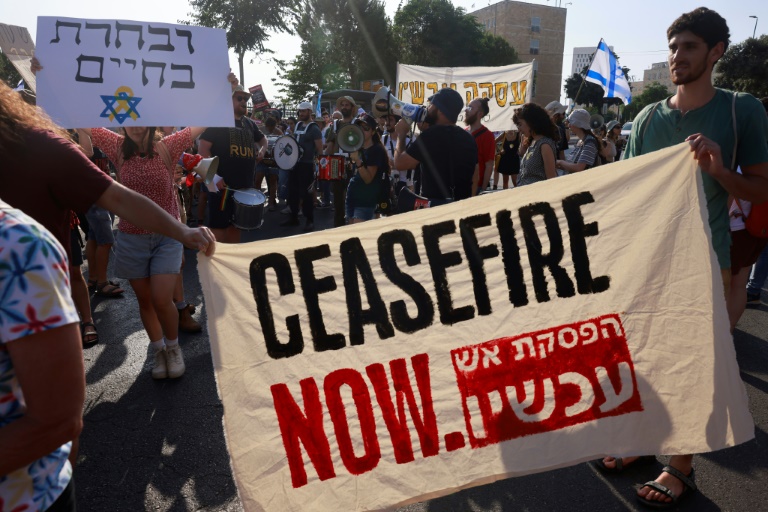A Jérusalem, des étudiants brandissant des photos d'Israéliens enlevés lors de l'attaque sans précédent du Hamas le 7 octobre contre Israël et retenus à Gaza, ont eux aussi appelé le gouvernement de Benjamin Netanyahu à arrêter la guerre et à ramener les otages à la maison lors d'une manifestation devant le Parlement.