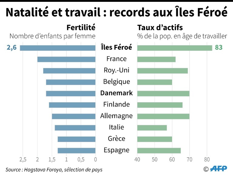 Sur ce territoire autonome danois de l'Atlantique Nord -- un archipel de 18 îles rocheuses volcaniques entre l'Islande et la Norvège -- distant de tout mais économiquement prospère, le nombre d'enfants tourne autour de 2,5 par femme depuis des décennies: un niveau sans équivalent ailleurs sur le Vieux Continent, où il languit généralement en-dessous de 2, selon les chiffres de la Banque mondiale.