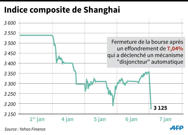 Au moment de la fermeture anticipée de jeudi, moins d'une demi-heure après le début des échanges, l'indice composite de la Bourse de Shanghai s'effondrait de 7,32% et celle de Shenzhen de 8,35%.