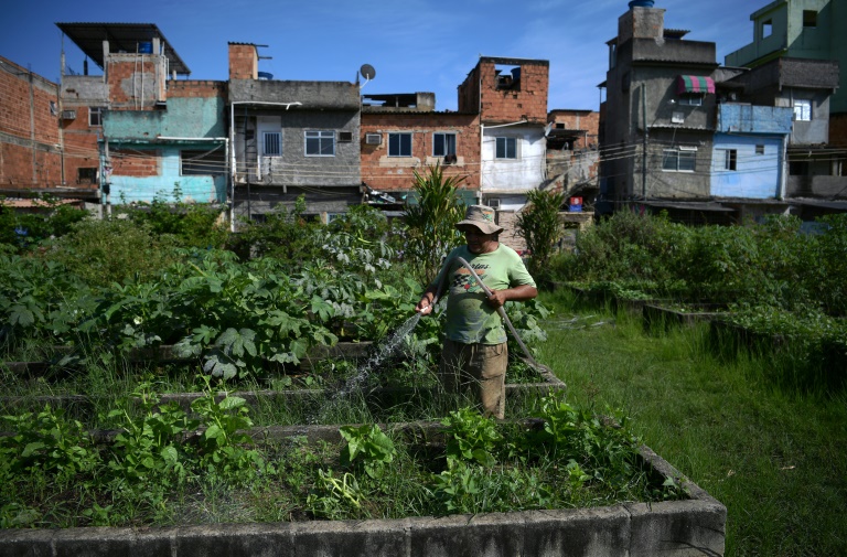 Non loin d'une voiture de police, de jeunes Brésiliens armés de pistolets surveillent une ruelle de Manguinhos, favela du nord de Rio de Janeiro où sévissent des gangs de narcotrafiquants. À première vue, ce n'est pas le cadre idéal pour planter des salades.