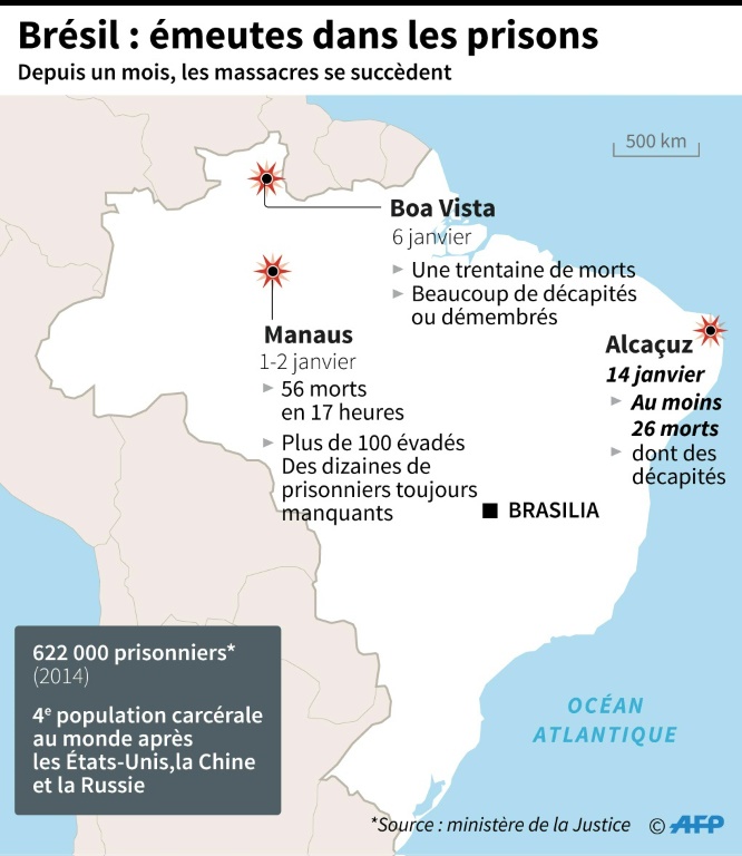 Pour séparer les prisonniers des deux gangs qui s'affrontent depuis le début de la mutinerie d'Alcaçuz, il y a une semaine, les forces de sécurité brésiliennes ont commencé samedi à ériger une barrière formée de dix-huit conteneurs. D'ici quinze jours elle devrait être remplacée par un mur en dur, a indiqué à l'AFP un porte-parole du gouverneur de l'Etat.