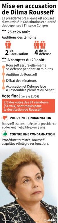 La présidente du Brésil Dilma Rousseff comparaît lundi au Sénat pour se défendre personnellement dans son procès en destitution, une ultime intervention avant sa probable éviction, point final à 13 ans de règne de la gauche dans le plus grand pays d'Amérique latine.