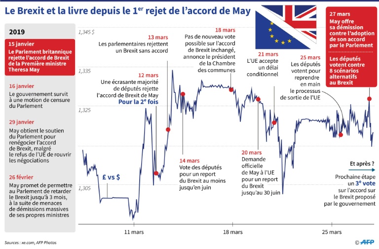 Theresa May cherche jeudi à sauver son accord de divorce avec l'Union européenne, au lendemain d'une nouvelle journée dramatique au pays du Brexit, qui l'a vue offrir sa démission et qui a montré un parlement inapte à s'entendre sur une autre voie à suivre.
