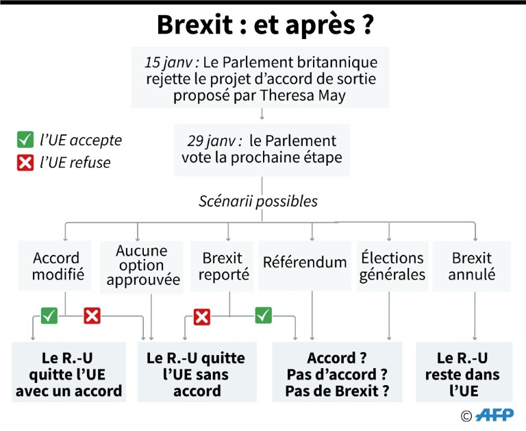 Interrogé sur la réaction de Bruxelles, qui a exclu une réouverture des négociations sur l'accord, le porte-parole a estimé que "le message des dirigeants européens est clair, ils veulent une sortie avec accord et ils comprennent que c'est dans l'intérêt de l'UE comme du Royaume-Uni". Il a ajouté qu'"on pouvait s'attendre à ce que la Première ministre s'entretienne avec l'UE dans la journée". L'accord de divorce signé par Mme May avec l'UE a été rejeté à une majorité écrasante par les députés britanniques.