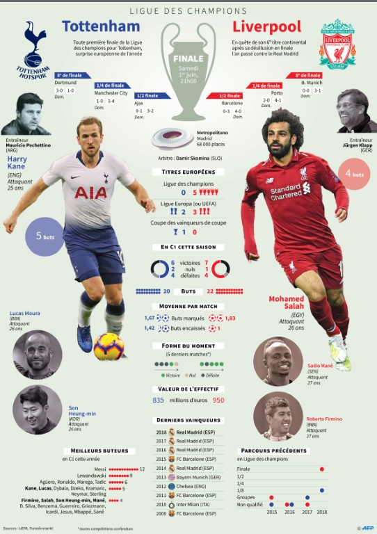 Au stade Metropolitano de l'Atlético, la "coupe aux grandes oreilles" va changer de pays d'accueil pour rejoindre l'Angleterre, après trois saisons de mainmise du Real Madrid de Zinédine Zidane et cinq années consécutives de monopole espagnol. Qui prendra le pouvoir ? Liverpool, quintuple champion d'Europe, battu en finale l'an dernier par le Real (3-1) et entraîné par le charismatique technicien allemand Jürgen Klopp ? Ou bien l'étonnant Tottenham de l'Argentin Mauricio Pochettino, un club qui vit sa première finale de C1 et brigue un premier sacre ?