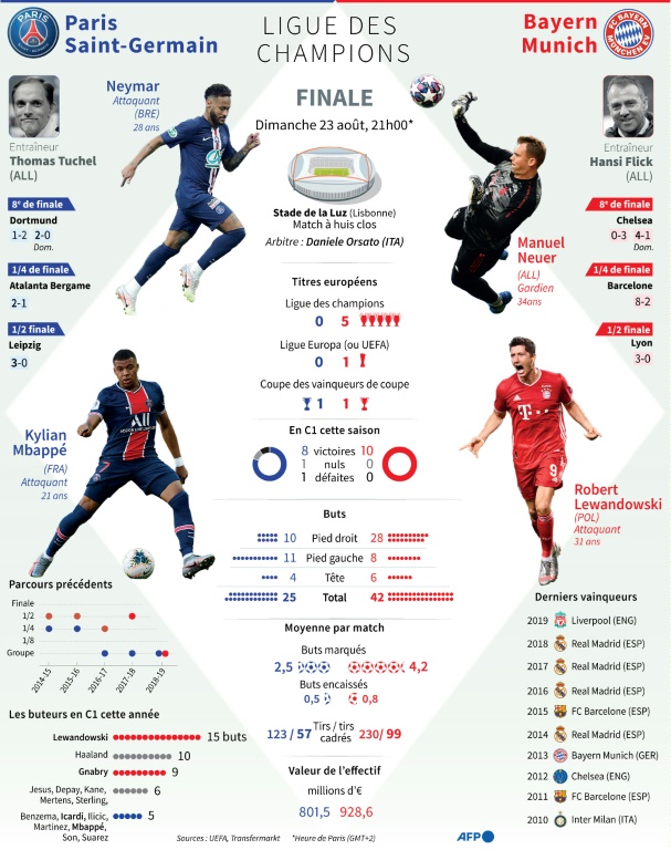 A Paris, seuls Angel Di Maria (2014), Neymar (2015) et Keylor Navas (2016, 2017, 2018) ont déjà atteint le Graal européen. Malgré la différence d'expérience à ce niveau, la dynamique créée depuis le déclic de Dortmund en 8e de finale, la victoire renversante contre l'Atalanta Bergame (2-1) en quarts, et la démonstration contre Leipzig (3-0) en demies, donnent de solides motifs d'espoirs au PSG.