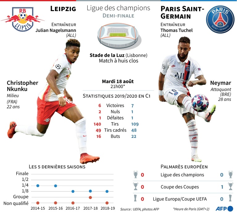 Première manche du match France-Allemagne version club en bouquet final du "Final 8": le PSG a l'occasion de se qualifier pour la première finale de Ligue des champions de son histoire, mardi (21h00, 19h00 GMT) à Lisbonne contre Leipzig, l'invité surprise qui bouscule aussi l'aristocratie du football continental.