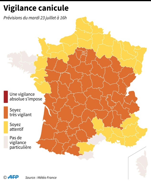 Météo-France a placé cinq départements en vigilance orange pour des orages à partir de 18 heures: Calvados, Manche, Orne, ainsi que Sarthe et Mayenne (deux départements qui restent aussi en vigilance canicule) , avec "de la grêle et des fortes pluies", avertit le prévisionniste de Météo-France François Jobard. Presque toute la France est concernée par la vigilance orange canicule/orages, à l'exception du grande frange Nord-Est, de la Bretagne et du pourtour méditerranéen et de la Corse. "Des records de chaleur sont attendus aujourd'hui dans le sud et jeudi dans la moitié nord", a fait savoir le prévisionniste. A Paris, le précédent record date de 1947 avec 40,4°C.
