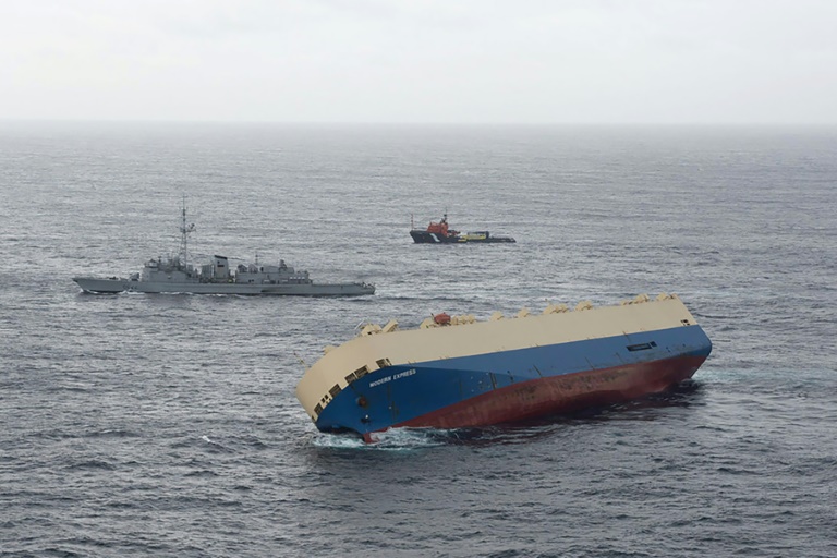Cinq bâtiments restaient dimanche dans la zone du cargo: une frégate, un remorqueur et un navire de dépollution français, et deux remorqueurs espagnols engagés par Smit Salvage. Un arrêté a été pris interdisant toute navigation ou survol de la zone, y compris par des drones.