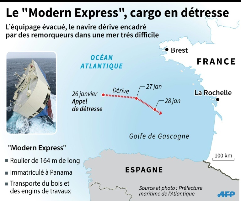 Le Modern express, cargo de 164 mètres de long, transportant 3.600 tonnes de grumes de bois et des engins de travaux, se trouvait dimanche vers 18H à 85 km à l'ouest du Bassin d'Arcachon, poursuivant sa dérive sud-est, ralentie à 1 noeud (1,8 km/h).