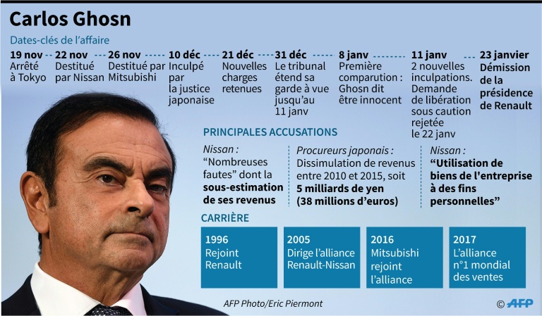Si Nissan s'est empressé de le révoquer de la présidence du conseil d'administration, suivi de Mitsubishi Motors, Renault l'a longtemps soutenu, arguant de la présomption d'innocence, mais M. Ghosn a finalement démissionné la semaine dernière de son poste de PDG, prenant acte de sa détention prolongée. La situation de gouvernance temporaire n'était selon lui plus tenable, d'où sa décision de se retirer, mais il aurait voulu avoir la possibilité de se présenter devant le conseil d'administration de Renault pour présenter sa version des faits. Il pourrait rester en prison jusqu'à son procès, qui n'aura pas lieu avant des mois, selon son équipe de défense. Il risque jusqu'à 15 ans de prison.