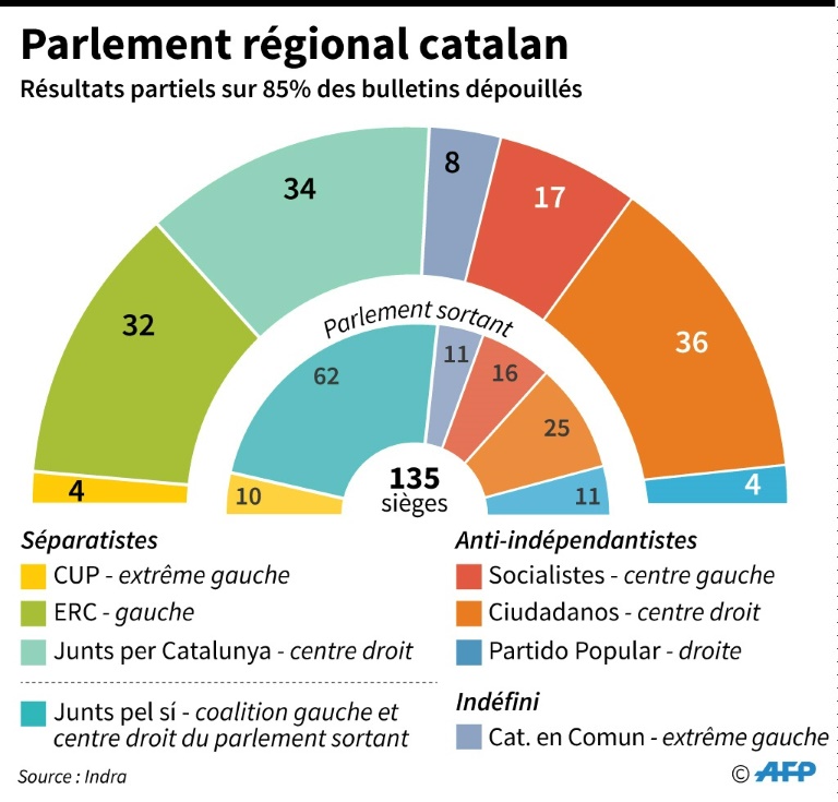 Les Catalans, qui ont battu avec près de 82% de votants le record historique de participation dans la région, ont accordé jeudi 47,6% des voix aux indépendantistes et près de 52% des suffrages aux partis défendant l'unité de l'Espagne. La loi électorale catalane prévoit un système de pondération des voix qui avantage les provinces rurales, où les indépendantistes sont très implantés, d'où leur victoire en sièges au parlement régional.