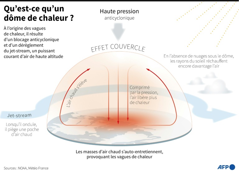En raison d'un vaste anticyclone statique, un dôme de chaleur se met en place, emprisonnant l'air chaud sous une chape et le réchauffant par compression au fil des jours.