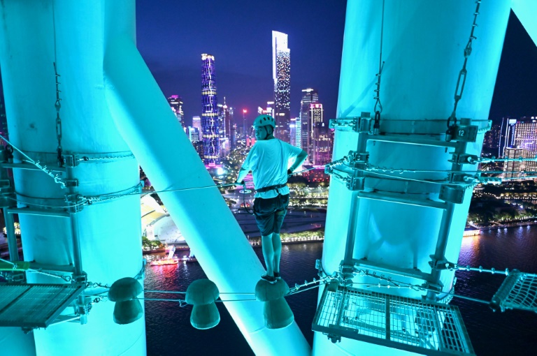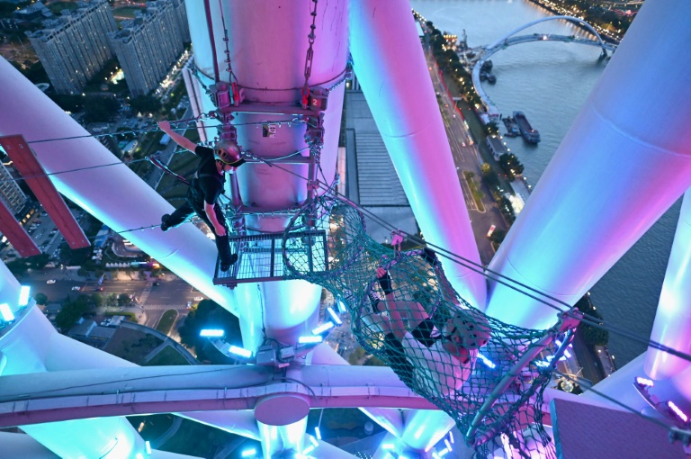 Au 57e étage, ils avancent d'un pas assuré sur une corde raide suspendue dans le vide: dans le sud de la Chine, les touristes en manque d'adrénaline font de l'accrobranche au sommet d'une tour de télévision.