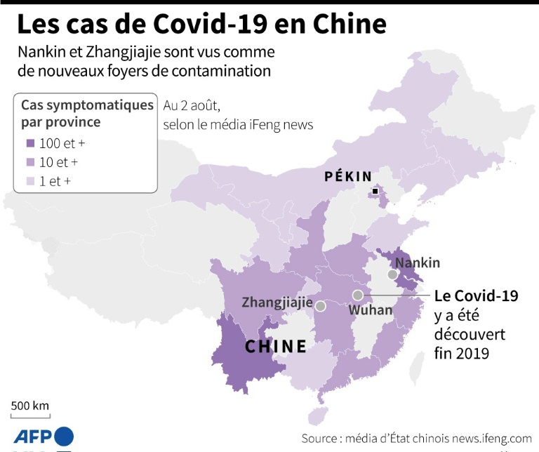 La Chine, qui a pratiquement éradiqué l'épidémie dès le printemps 2020, est confrontée depuis quelques semaines à la résurgence la plus étendue du virus depuis l'an dernier. Avec plus de 400 nouvelles infections depuis la mi-juillet, ce regain de contamination reste toutefois très limité par rapport aux chiffres enregistrés dans d'autres pays.