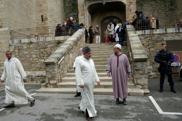 Des représentants de la communauté musulmane, qui ont tenu à s'associer à l'hommage aux victimes, s'engouffrent dans l'église, le visage marqué. "Votre présence nous dit que les fauteurs de haine ne gagneront pas", leur dit l'évêque de Carcassonne et Narbonne, Mgr Alain Planet, durant la messe.