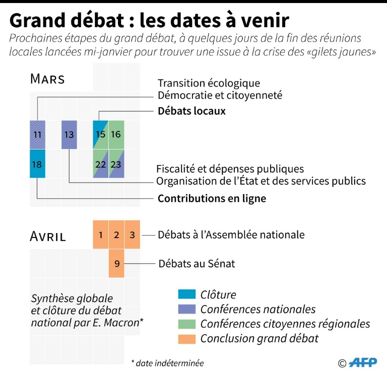 Emmanuel Macron s'est donné un mois pour trancher et va poursuivre sa tournée des régions. Il devrait clore le débat à partir de la mi-avril, donner "les grands axes de réponse et le sens de la direction à suivre".
