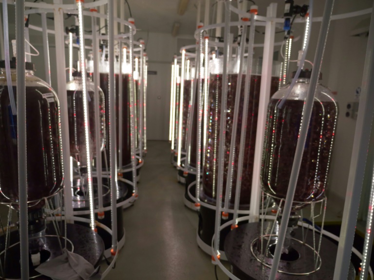 Une partie de la production est assurée en pleine mer et une autre sur la terre ferme, dans des bassins alimentés en eau de mer, "un cadre qui permet de contrôler la lumière, la quantité de nutriments, la disponibilité en carbone et surtout (qui est) plus facilement reproductible qu'une concession marine".