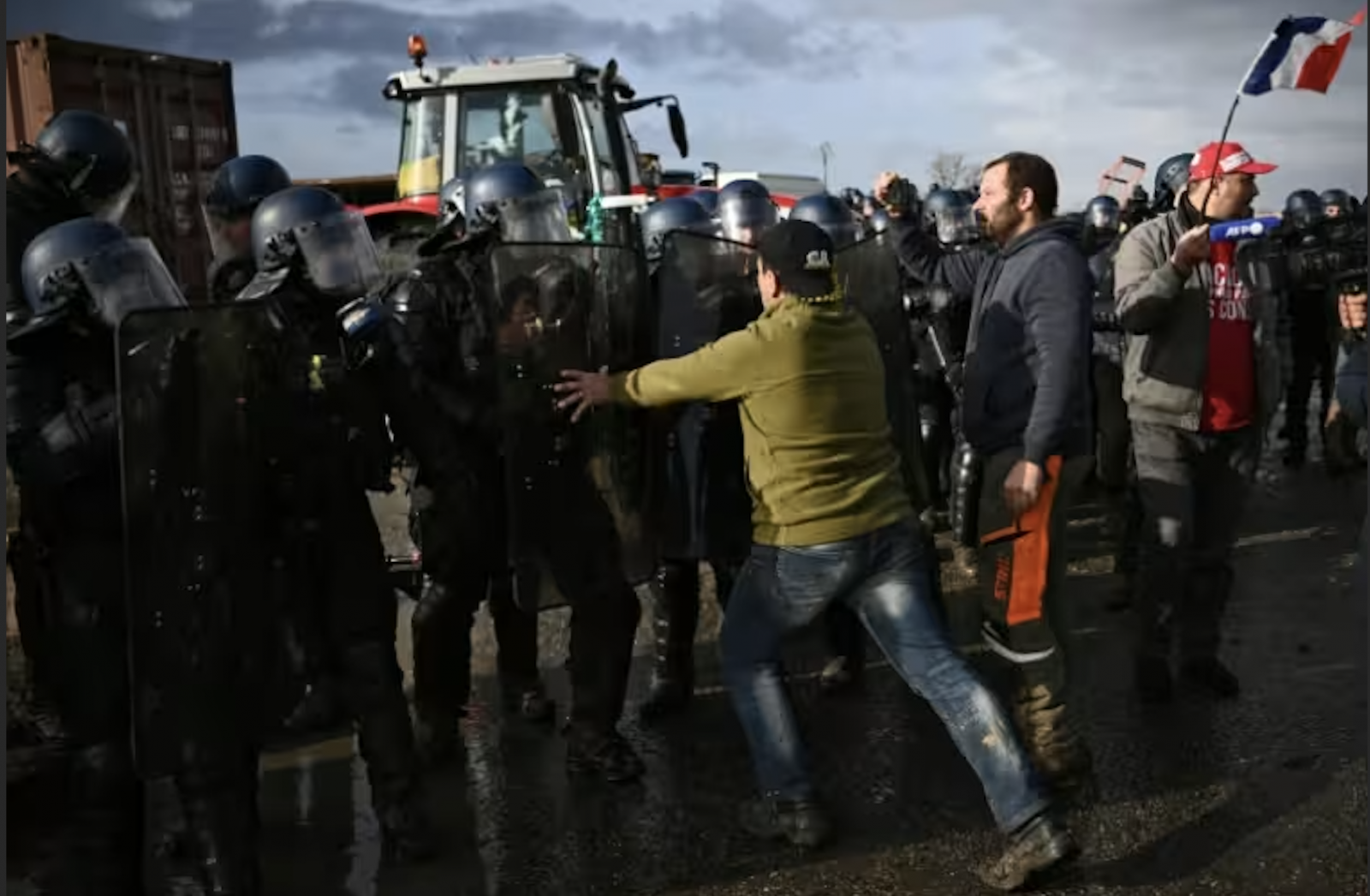 Une heure plus tôt, une partie de la quarantaine d'agriculteurs installés devant les dépôts pétroliers DPA, bloqués depuis mercredi soir, en étaient brièvement venus aux mains avec les forces de l'ordre qui ont ceinturé le rond-point.