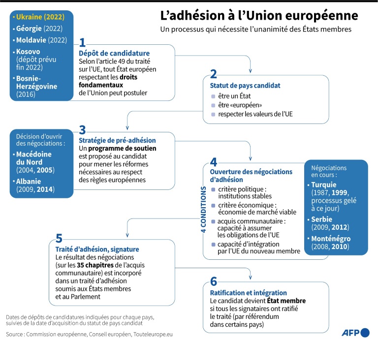 "Le choix de donner le statut de candidat à l'Ukraine et à la Moldavie est un geste politique très fort, mais les conditions pour ouvrir les négociations sont exigeantes et la décision nécessite l'unanimité", a rappelé le représentant d'un État membre.
