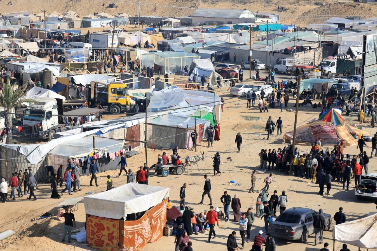 Des Palestiniens ayant fui Khan Younès, à moins de 10 kilomètres, y ont monté un camp de fortune -tentes avec des toiles, des bâches en plastique, des lattes de bois. Pour leur survie: des branches ramassées ici et là pour faire du feu, de la semoule dans des gamelles pour unique nourriture. Des déplacés errent avec leur jerrican à la recherche d'eau.