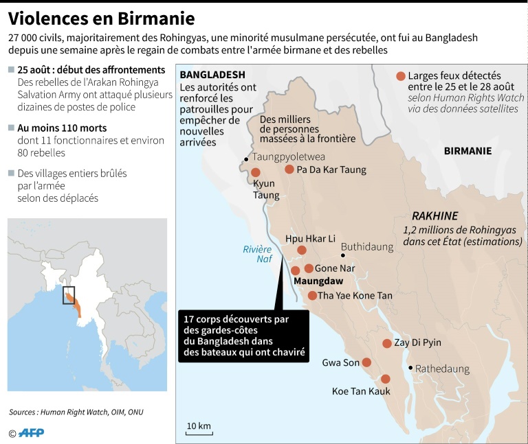 Les combats qui opposent des rebelles musulmans rohingyas et l'armée dans le nord-ouest de la Birmanie ont fait au moins 400 morts en une semaine et poussé des dizaines de milliers de personnes à fuir vers le Bangladesh.