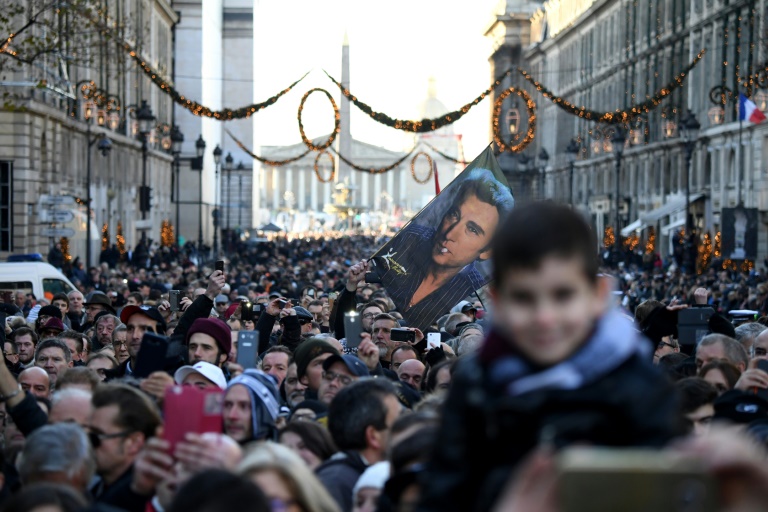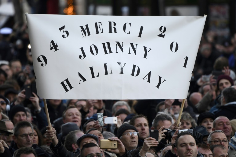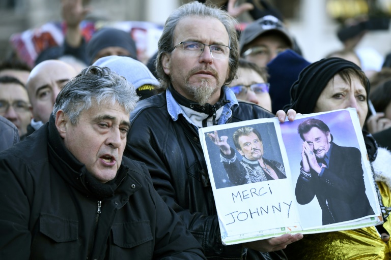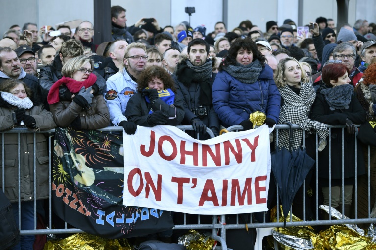 Ça et là, la foule entonne des tubes, notamment "Allumer le feu", "Que je t'aime", "Marie", ou "Laura", d'autres les jouent en boucle sur leur téléphone. La Sécurité civile a distribué des couvertures de survie aux reflets métalliques pour aider les personnes présentes à surmonter le froid. Sur la place de la Concorde, la grande roue est aussi parée d'un portrait du rockeur disparu et affiche le slogan "Johnny au revoir".