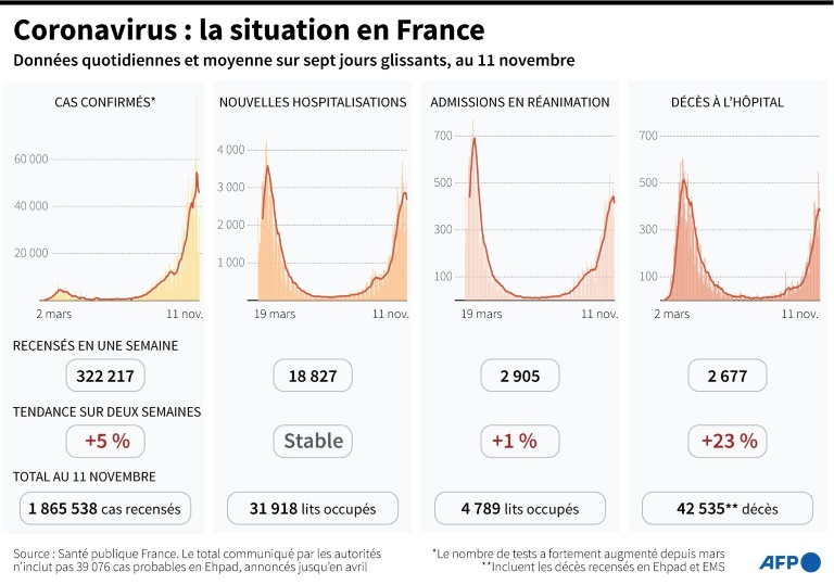 Le rythme des entrées dans les services de réanimation augmente lui aussi toujours, avec 2.605 nouvelles arrivées sur les sept derniers jours au 1er novembre, 2.884 sur la même durée le 4, et plus de 3.000 depuis le 7 novembre, sauf mercredi (2.906).