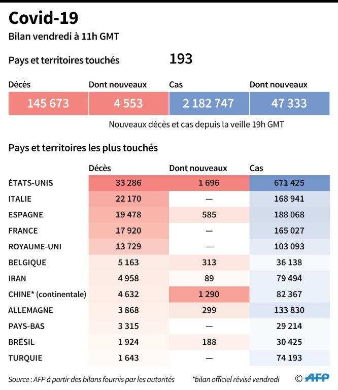 S'y ajoutent des risques sociaux redoutés par les spécialistes : accroissement des inégalités, violences domestiques, montée de l'anxiété et de la consommation d'alcool, aggravation des problèmes de santé autres que le Covid-19... Encouragés par des signes de ralentissement de l'épidémie (tassement des hospitalisations et des morts), plusieurs pays envisagent un allègement de leurs mesures de confinement, en rouvrant progressivement les écoles et en renvoyant les confinés au travail.