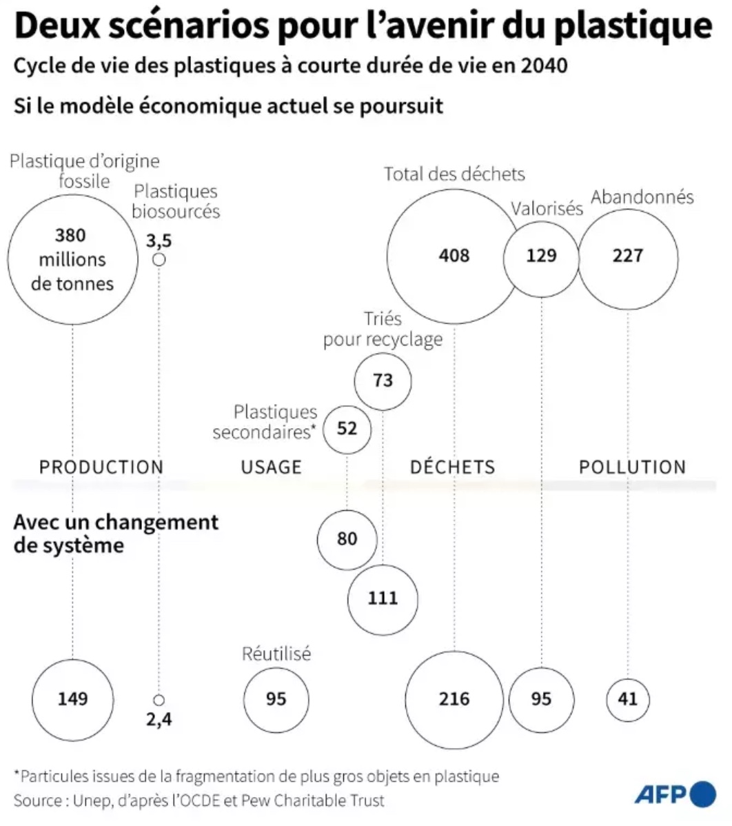 En 2019, 353 millions de tonnes de déchets plastiques ont été produites dans le monde, dont 22% ont fini abandonnées, c'est-à-dire dans des décharges sauvages, brûlées à ciel ouvert ou rejetées dans la nature, selon le Programme des Nations unies pour l'environnement (PNUE).