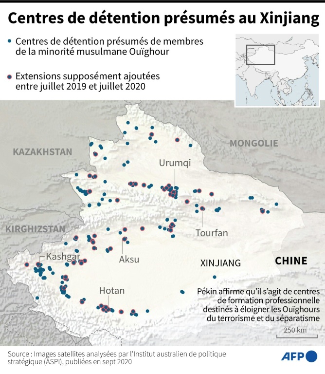 Des études occidentales, fondées sur des interprétations de documents officiels, des témoignages de victimes présumées et des extrapolations statistiques, accusent Pékin d'avoir interné dans des "camps" au moins un million de personnes, majoritairement ouïghoures, d'effectuer des stérilisations et avortements "forcés" ou encore d'imposer du "travail forcé".