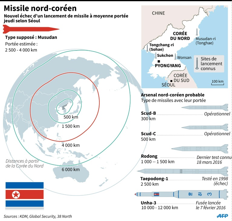 Le 15 avril dernier, date anniversaire du fondateur du régime Kim Il-Sung, le Nord avait déjà essuyé un revers cuisant en testant un missile Musudan, engin qui serait capable de frapper les bases militaires américaines de l'île de Guam, dans le Pacifique.