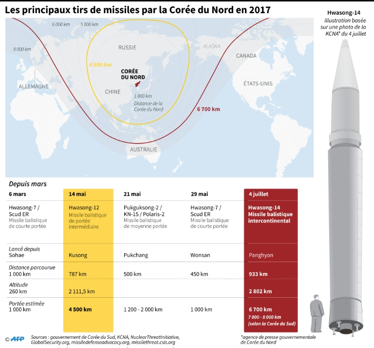 Le lancement rĂ©ussi d'un missile intercontinental est un succĂšs majeur pour le rĂ©gime de Pyongyang, dont l'objectif avouĂ© est d'ĂȘtre en mesure de menacer le sol continental amĂ©ricain du feu nuclĂ©aire. "Cela n'arrivera pas", avait promis en janvier Donald Trump.