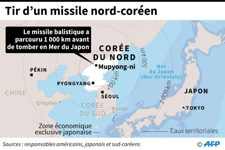 Le missile nord-coréen "est tombé dans notre zone économique exclusive, en mer du Japon" sans faire de dégâts, a déclaré le porte-parole du Premier ministre Shinzo Abe. M. Abe a convoqué son conseil de sécurité nationale, à l'instar du président sud-coréen Moon Jae-In. L'ONU a infligé six séries de sanctions à Pyongyang depuis 2006 mais deux résolutions adoptées l'an dernier les ont particulièrement renforcées.