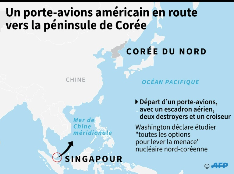 Donald Trump avait promis il y a quelques semaines de "traiter" le "problème" du programme nucléaire nord-coréen et annoncé que le porte-avions américain Carl Vinson faisait route vers la péninsule coréenne. La Corée du Nord s'était engagée à "répliquer à toute attaque nucléaire par une attaque nucléaire".