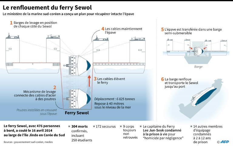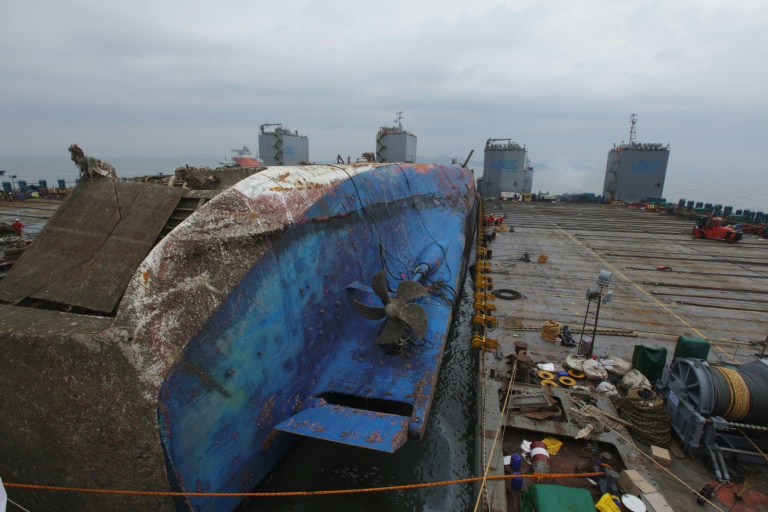 Le consortium chargé du renflouement du Sewol est parvenu samedi à placer le ferry sud-coréen sur un bâtiment semi-submersible en vue de son transfert vers un port, trois ans après le naufrage qui avait fait 304 morts.