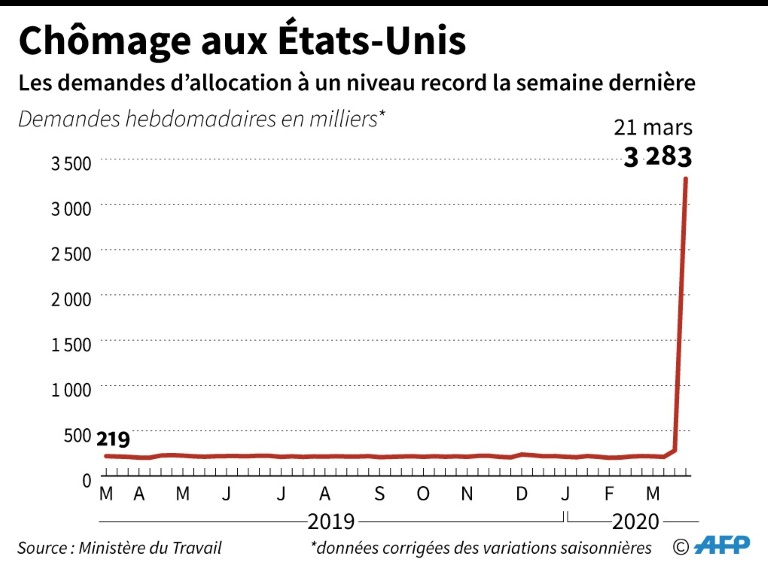 Aux Etats-Unis, les demandes d'allocations chômage ont explosé de 1.000% la semaine écoulée et atteint un record historique. Le président américain Donald Trump, qui avait beaucoup misé sur l'économie pour sa réélection en novembre, a proposé une reprise graduelle de l'activité dans certaines parties du pays moins touchées par le Covid-19.