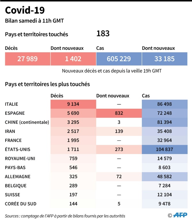 Par centaines, le terrible décompte des morts du nouveau coronavirus a continué de s'alourdir samedi en Europe, particulièrement en Italie et en Espagne, mais la pandémie avance aussi à grande vitesse aux Etats-Unis, où Donald Trump a finalement renoncé à placer New York en quarantaine. La pandémie a déjà fait plus de 30.000 victimes, les deux tiers en Europe, continent le plus durement touché.