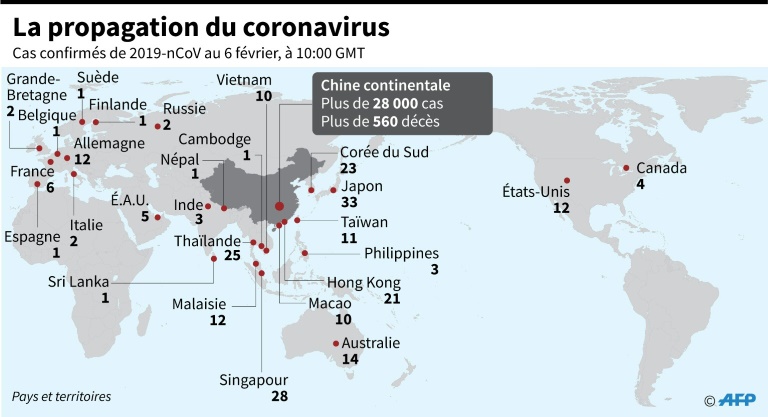 Le bilan de l'épidémie s'élève à plus de 630 morts en Chine continentale (hors Hong Kong et Macao), la province du Hubei ayant fait état vendredi de 69 nouveaux décès (et de 2.447 nouveaux cas). Ailleurs, deux décès ont déjà été imputés à la maladie, l'un aux Philippines et l'autre à Hong Kong.