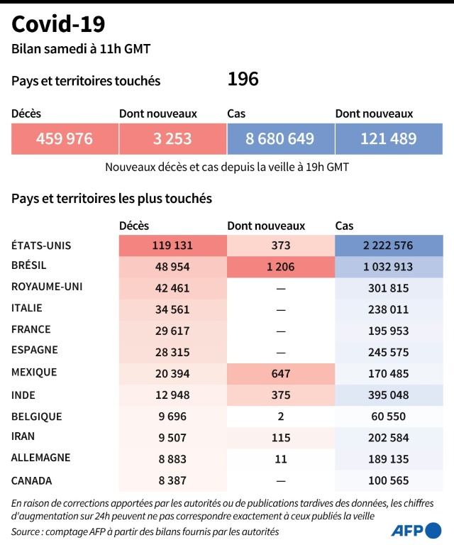 La pandémie du nouveau coronavirus a fait au moins 459.976 morts dans le monde depuis que la Chine a fait officiellement état de l'apparition de la maladie en décembre, selon un bilan établi par l'AFP à partir de sources officielles samedi à 15h00 (heure de La Réunion)