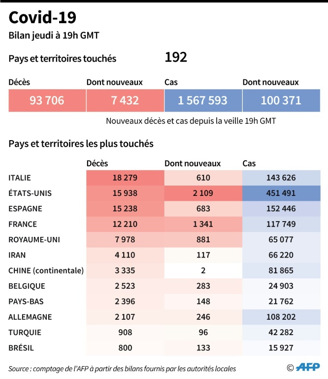 Plus de 94.000 personnes ont succombé à la pandémie qui, selon la patronne du Fonds monétaire international (FMI), Kristalina Georgieva, aura "les pires conséquences économiques depuis la Grande Dépression" de 1929.