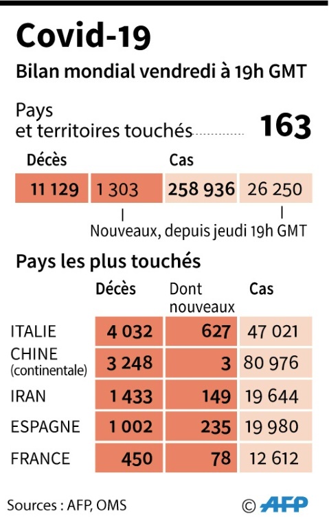 Des centaines de milllions de personnes dans le monde sont confinées chez elle pour le week-end, dans l'espoir d'enrayer la pandémie de coronavirus, qui a déjà fait plus de 11.000 morts, et ébranlé l'économie mondiale.