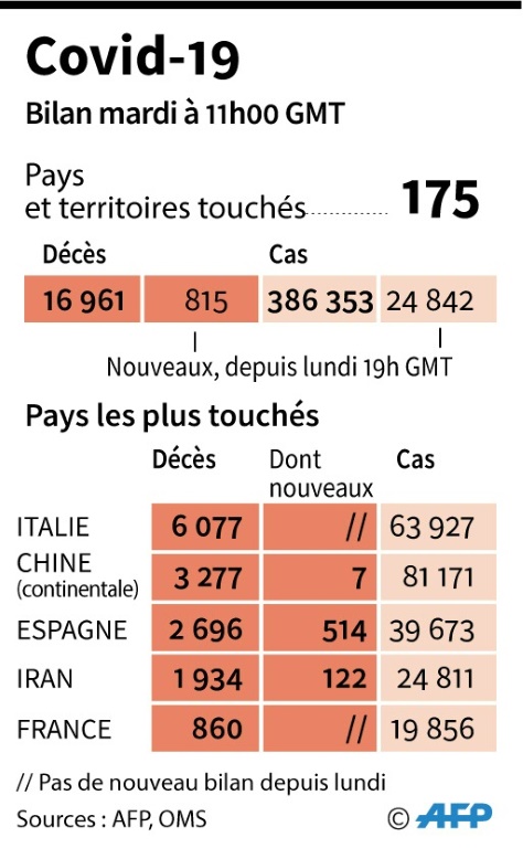 Cette image optimiste tranche avec la situation ailleurs dans le monde. D'après un bilan établi par l'AFP à partir de sources officielles, près de 17.000 personnes ont perdu la vie à cause de ce virus et plus de 386.350 cas d'infection ont été diagnostiqués dans 175 pays et territoires.